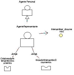 Los agentes encargados de representar a la organización frente a otras serán variantes de los Agentes Personales. Ello plantea interesantes posibilidades como que un agente representando una organización intervenga en el proceso de evaluación de documentos de otras comunidades de otras organizaciones. El nuevo agente se denomina Agente Representante (ver Ilustración 167 ).