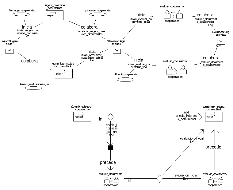 Para observar el grado de aceptacion de la nueva sugerencia, se modifica el estado de la sesion a "BROADCAST". Los posibles fallos en la transmision se detectan mediante timeouts generados por temporizadores dentro de la interaccion para evaluar documentos. De los miembros de la comunidad que tomaran parte en esta difusion se excluyen aquellos que tomaron parte en el proceso de evaluacion. Al contrario que en casos anteriores   |