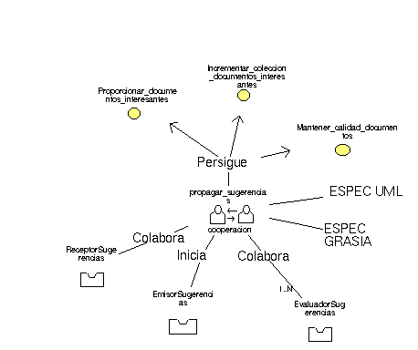 | Descripcion | La propagacion de sugerencias consisten en el envio por parte del usuario de documentos y en la difusion de estos dentro de una comunidad. El proceso de tramitación de sugerencias es similar al de alta en la comunidad en cuanto que se precisa de la opinión de los miembros de la comunidad. La diferencia radica en que las sugerencias, si son evaluadas positivamente por usuarios y comunidad, se radian al resto de miembros y se recogen sus opiniones nuevamente. El resultado es evaluado en el emisor de sugerencias de forma que se preserva el anonimato de los evaluadores.   |