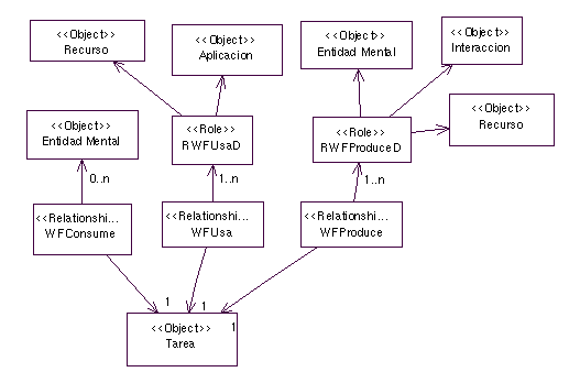 Las tareas (Ilustración 5) se describen mendiante meta-relaciones que definen precondiciones (WFConsume, WFUsa, GTAfecta) y postcondiciones (WFProduce, GTAfecta). WFConsume indica que para que se ejecute la tarea se necesita que existan determinadas entidades mentales (objetivos, creencias, hechos, etc.). La meta-relación WFUsa indica que se necesitan algunos de los recursos que se identifican en el meta-modelo de entorno. GTAfecta indica que se actúa sobre una entidad mental, por lo que se requiere de su existencia. Las postcondiciones se representan con WFProduce y GTAfecta. WFProduce indica la creación de entidades mentales, interacciones o reposición de recursos en el seno de un flujo de trabajo. GTAfecta también puede señalar la creación de entidades mentales, pero se usa para indicar cambios en las entidades mentales no relacionadas con el flujo de trabajo en que se enmarca.
