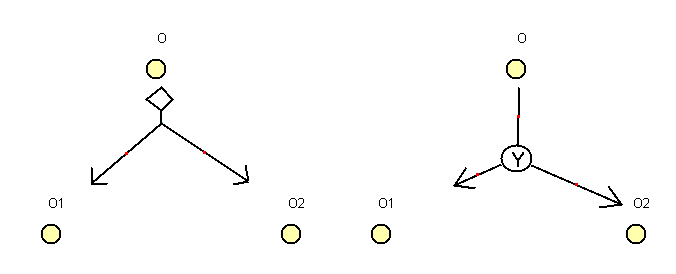 Ilustración 12. Modelo de objetivos y tareas para mostrar la descomposición de O en O1 y O2 (izquierda) y las dependencias entre éstos (derecha)