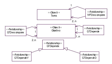 Debido a la complejidad que pueden existir en los objetivos y las tareas, se han incorporado meta-relaciones que representan la descomposición de objetivos y tareas (GTDescompone y WFDescompone). Estas relaciones de descomposición dan lugar a grafos acíclicos donde se distinguen tareas, objetivos, sub-tareas y sub-objetivos. Este aspecto estructural se complementa con la expresión de dependencias entre objetivos. Nótese que no se incorporan dependencias entre tareas, aunque éstas son expresables mediante otras relaciones que se verán a continuación. La descomposición de objetivos da lugar a árboles Y/O [Rich y Knight 90], que están soportados por instancias de GTDependeY y GTDependeO. GTDependeY asume que cuando todos los sub-objetivos (los definidos por esta relación) han sido satisfechos, el objetivo padre puede darse por alcanzado. La definición de GTDependeO se diferencia en que sólo se requiere que al menos uno de los objetivos referenciados haya sido satisfecho. Estas instancias también se usan para transmitir un fallo desde un sub-objetivo al objetivo padre. La transmisión de fallos desde los sub-objetivos al padre se hace en función del tipo de dependencia. GTDependeY hace que el objetivo padre falle si cualquiera de sus sub-objetivos falla. GTDependeO hace que el objetivo padre falle si todos sus sub-objetivos fallan.