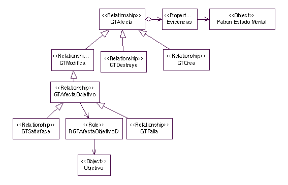 Para el caso de los objetivos, se ha especializado la relación GTModifica. Como el desarrollo que se propone se basa en la utilización de objetivos, es justificable el considerar cómo se satisfacen o fracasan los objetivos. Por ello se ha dispuesto de dos especializaciones que concretan la forma de modificar un objetivo: satisfaciéndolo (GTSatisface) o haciéndolo fallar (GTFalla). Estas dos últimas se condicionan a la existencia de ciertas evidencias que indiquen cuándo tiene lugar el fallo o la satisfacción del objetivo (propiedad Evidencia). Esta condición se expresa con patrones de estado mental, ya mencionados en el capítulo anterior. Queda pendiente el decidir qué hacer cuando se alcanza un objetivo o cuando este fracasa. Aquí se consideran dos enfoques: