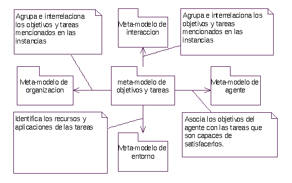 Este meta-modelo se orienta principalmente a justificar la ejecución de tareas basándose en los objetivos, que a su vez, se van modificando tras dicha ejecución. Por ello, la mayoría de relaciones con los modelos consiste en recoger, agrupar e interrelacionar los objetivos que aparecen en ellos, poniéndolos en el contexto de justificantes de la ejecución de tareas (ver Ilustración 14). Así, las relaciones con los meta-modelos de agente, organización e interacción se reduce a recoger todos los objetivos y tareas que allí aparecen y trabajar con ellos.