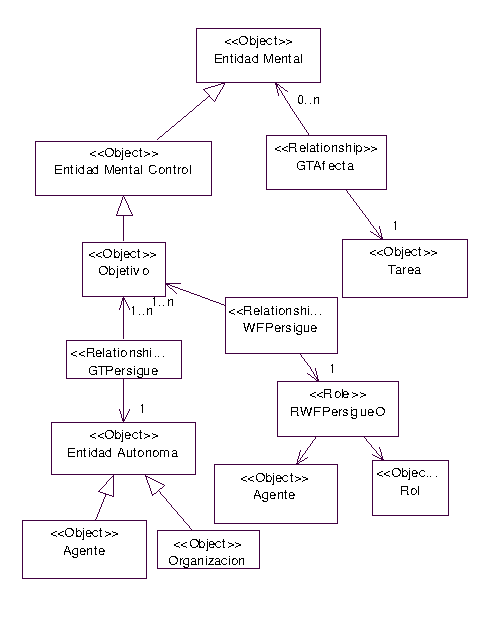 En el meta-modelo se refleja la relación de los objetivos con los agentes, roles y organizaciones. Una organización, como entidad autónoma al igual que un agente persigue objetivos (GTPersigue). Los roles, por el contrario, se asocian con los objetivos en el marco de los flujos de trabajo, por ello se asocian con otra meta-relación, WFPersigue. Los agentes, por poder aparecer en los flujos de trabajo y ser una entidad autónoma, como la organización, pueden asociarse con cualquiera de las dos.